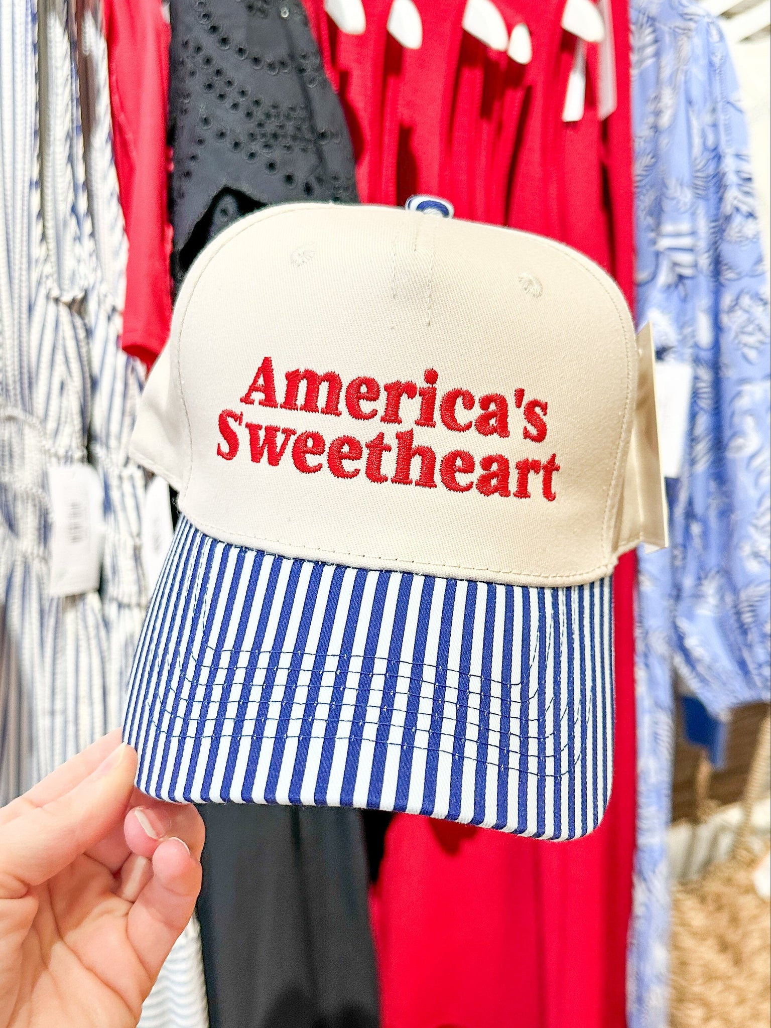 Designed for trend-loving shoppers, this hat features bold “America’s Sweetheart” embroidery, an adjustable snapback, and solid or printed bill options for easy merchandising. Perfect for summer, this two-toned trucker hat blends nostalgic Americana energy with modern fashion appeal.