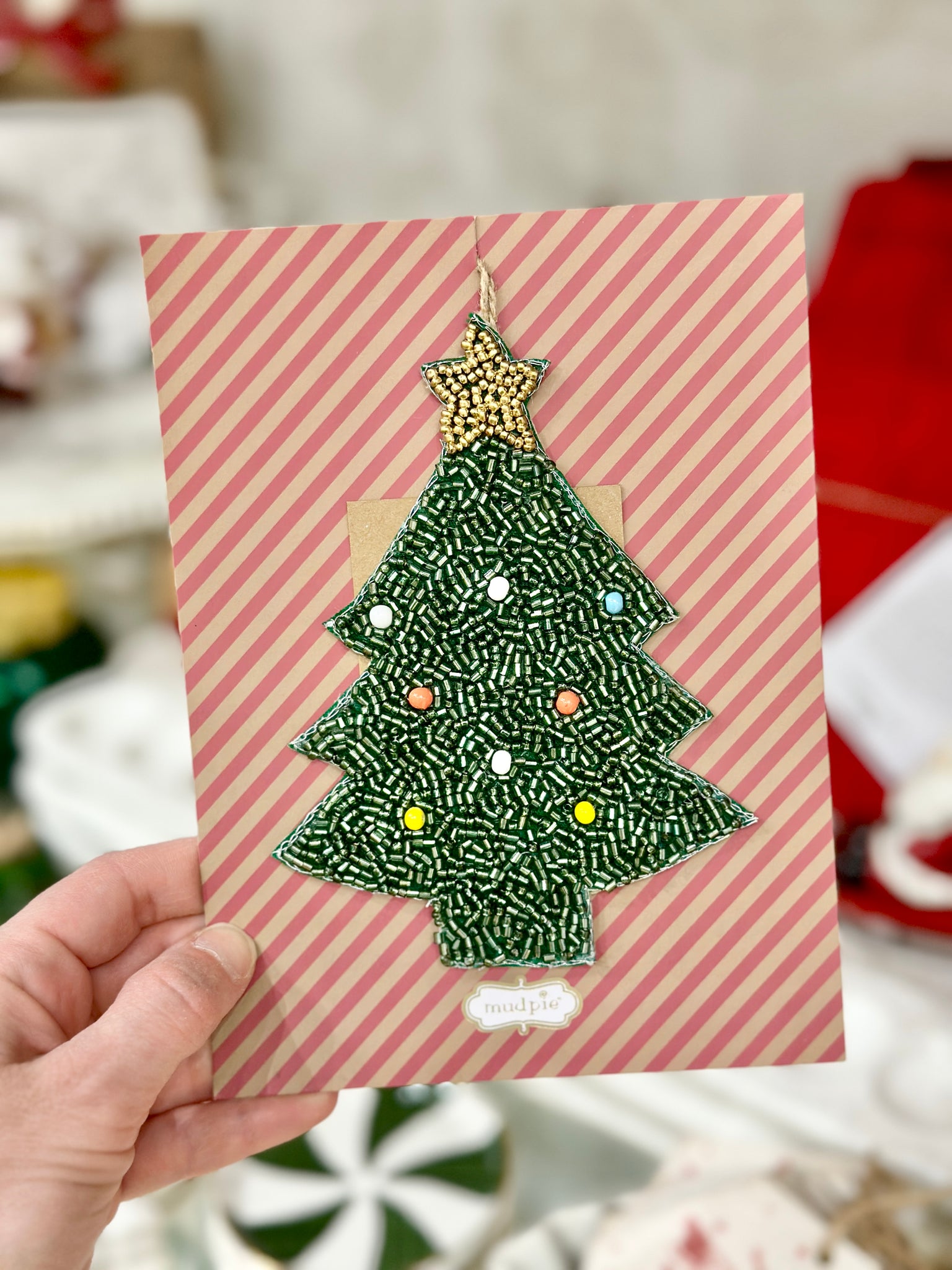 Beaded felt ornament features back pocket to hold gift card and jute hanger.