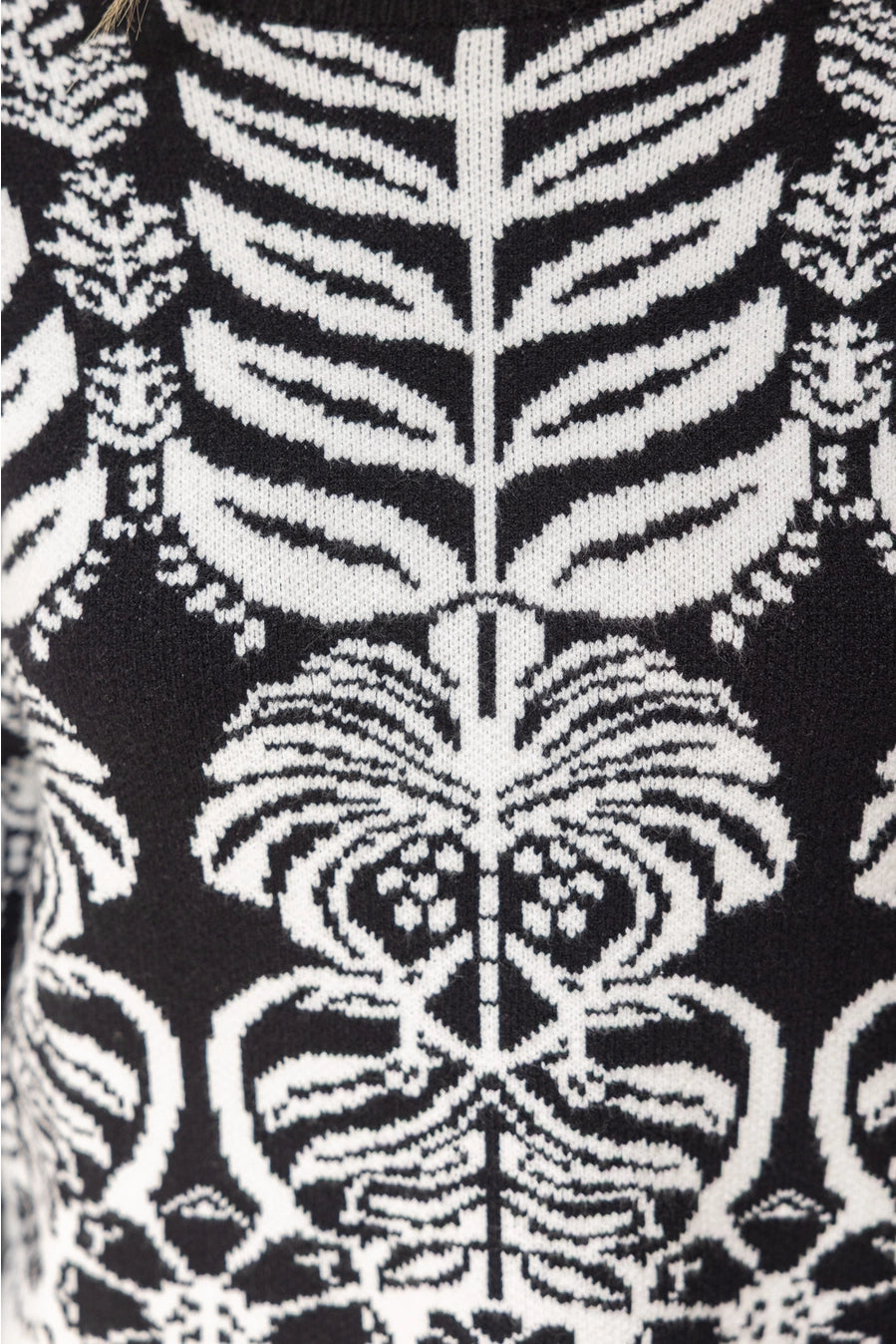 A bold knit pullover featuring a black base with ivory floral and leaf patterns. Designed with a round neckline, long sleeves, and ribbed trim with a scalloped hem for a unique finish. Perfect for fall and winter layering, this statement sweater pairs effortlessly with denim, trousers, or skirts for chic day-to-night outfits.
