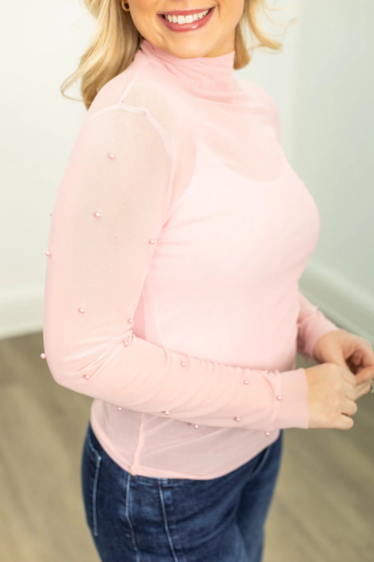 Pink Mock Neck Mesh Top with Pearls