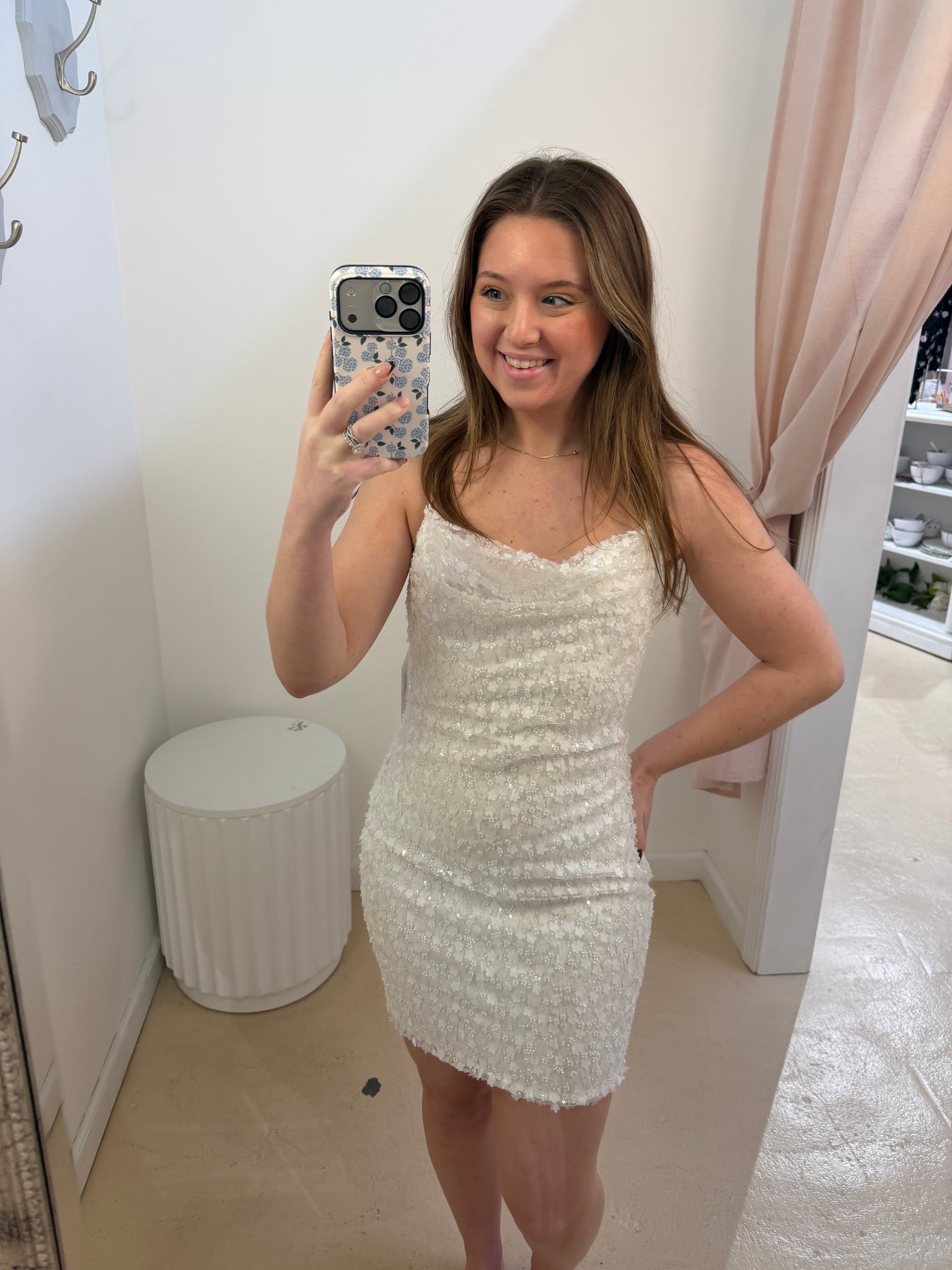 White Beaded Cowl Neck Mini Dress