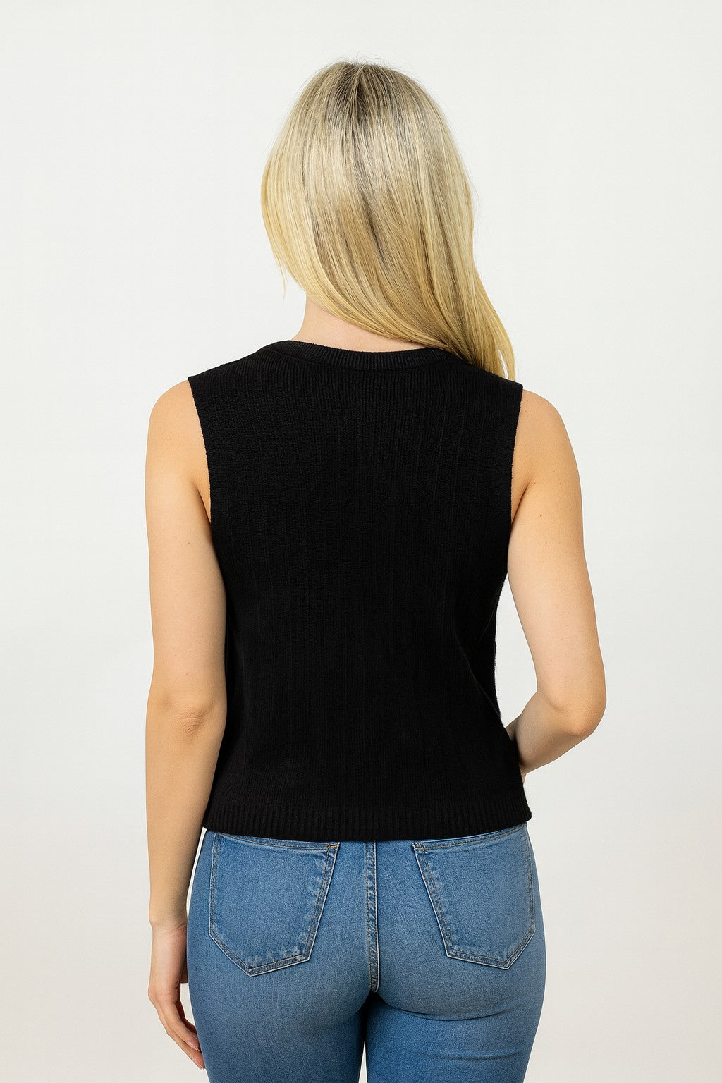 A chic sleeveless knit top featuring a sparkling jeweled